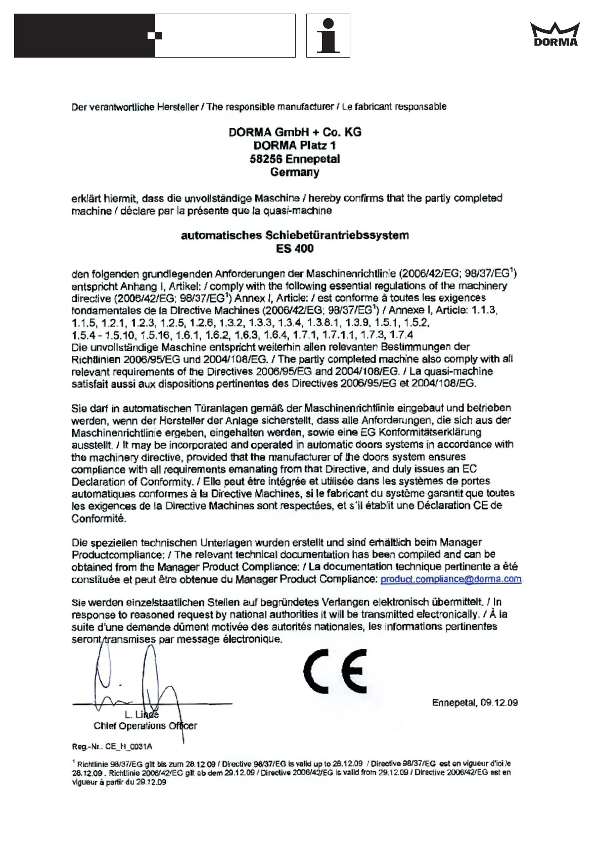 Dorma ES 410 - EG Einbauerklärung; EC Declaration of Incorporation