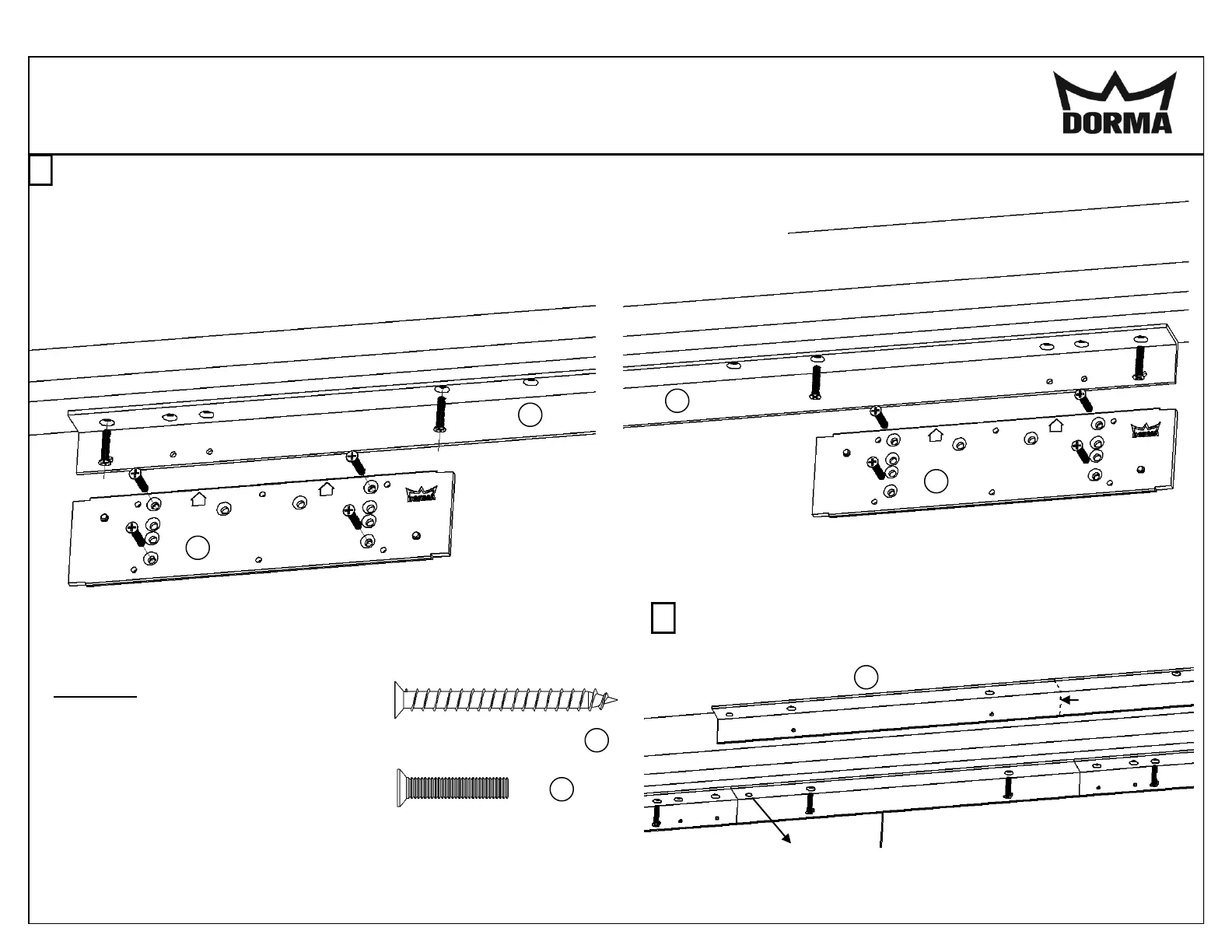 Attach both closer mounting plates to the doors using 8 flat head screws, 4 ea. Arrows on plate pointing upwards.