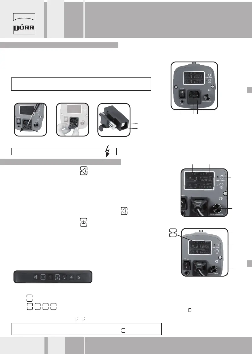 Monte el cabezal del flash en un soporte de luz adecuado. Contecte el cable de alimentación en la toma de corriente (3). Compruebe que el cabezal está