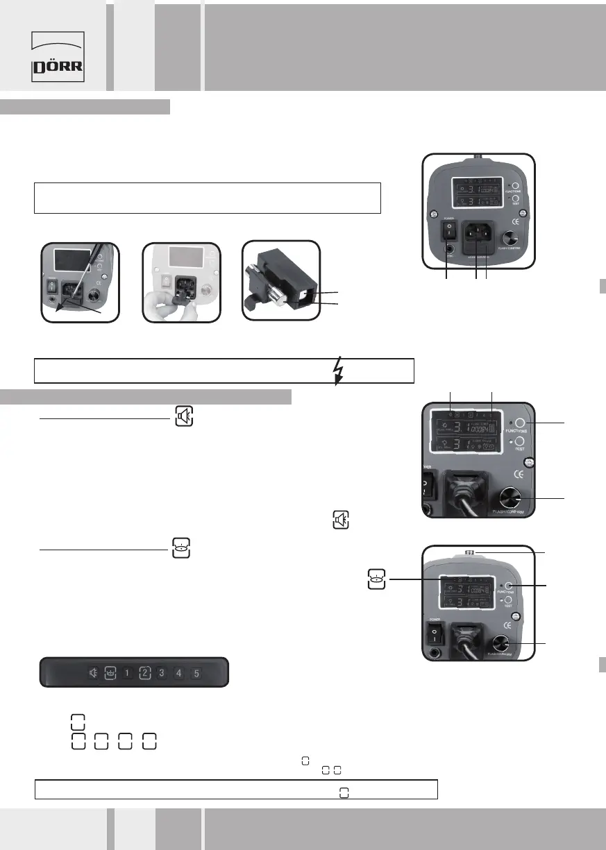 Blitzkopf ausgeschaltet ist (Ein-/ Aus- Schalter 1 in Position 0). Dann schliessen Sie das Netzkabel an das Stromnetz an (220V). Danach schalten Sie den Blitzkopf an