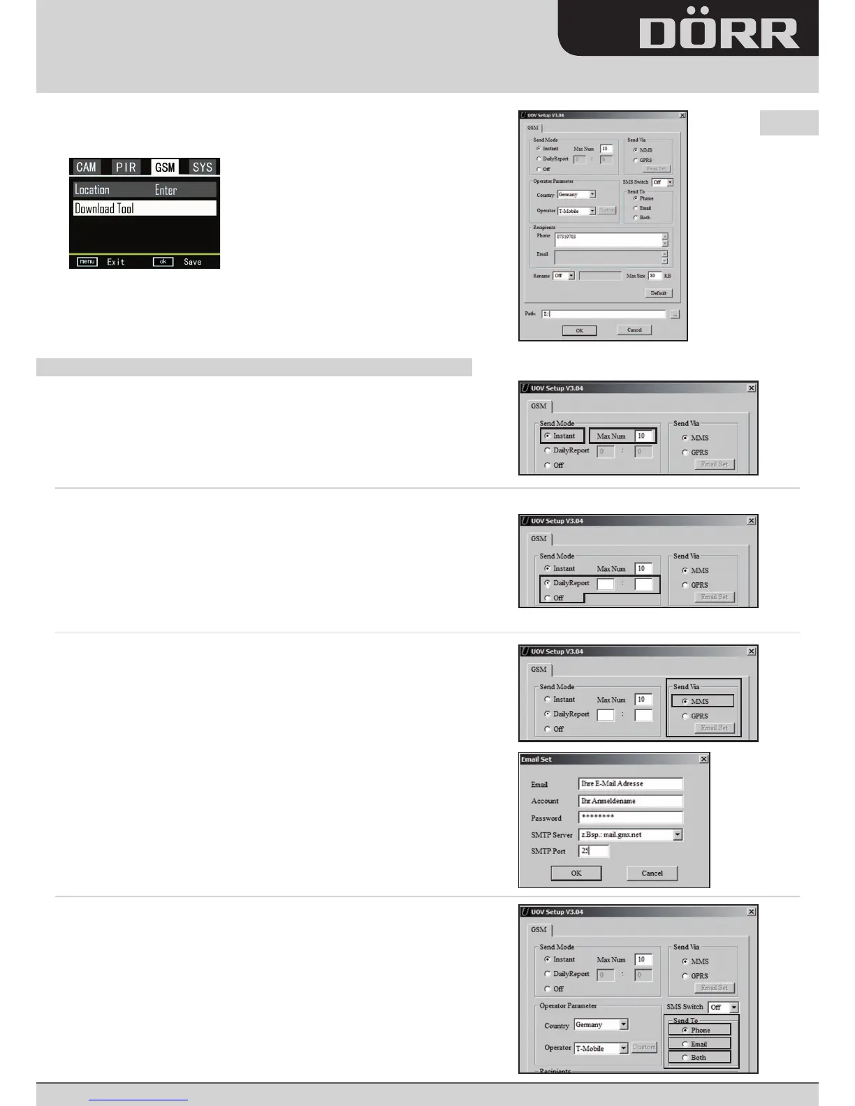 „GPRS“ also Versand per E-Mail wählen, werden Sie daran erinnert, dass Sie die Parameter