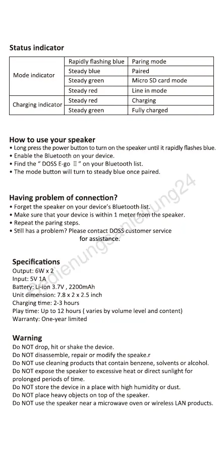 Doss E-go II - Speaker Features and Operation; Status Indicators; Usage Guide; Troubleshooting & Specifications