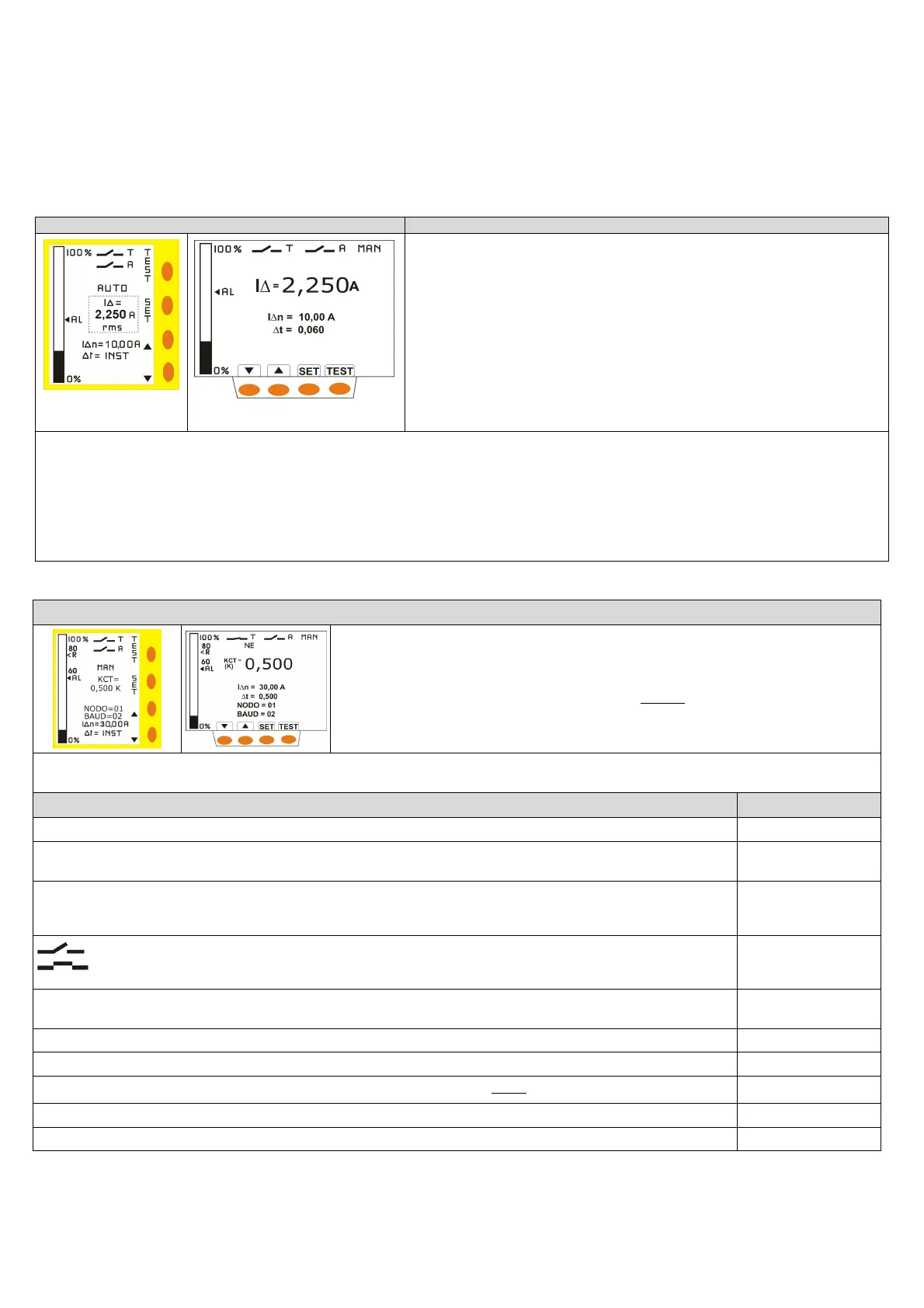 N.De.=indica lo stato di riposo del relè di TRIP. E’ normalmente diseccitato (N.De.) e si eccita quando la ID supera la IΔn.