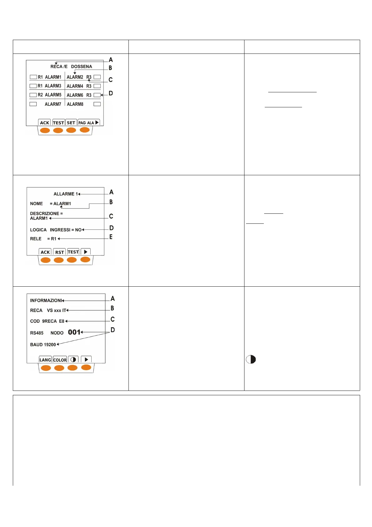 D - Stato allarmi: rettangolo pieno = allarme attivo,
