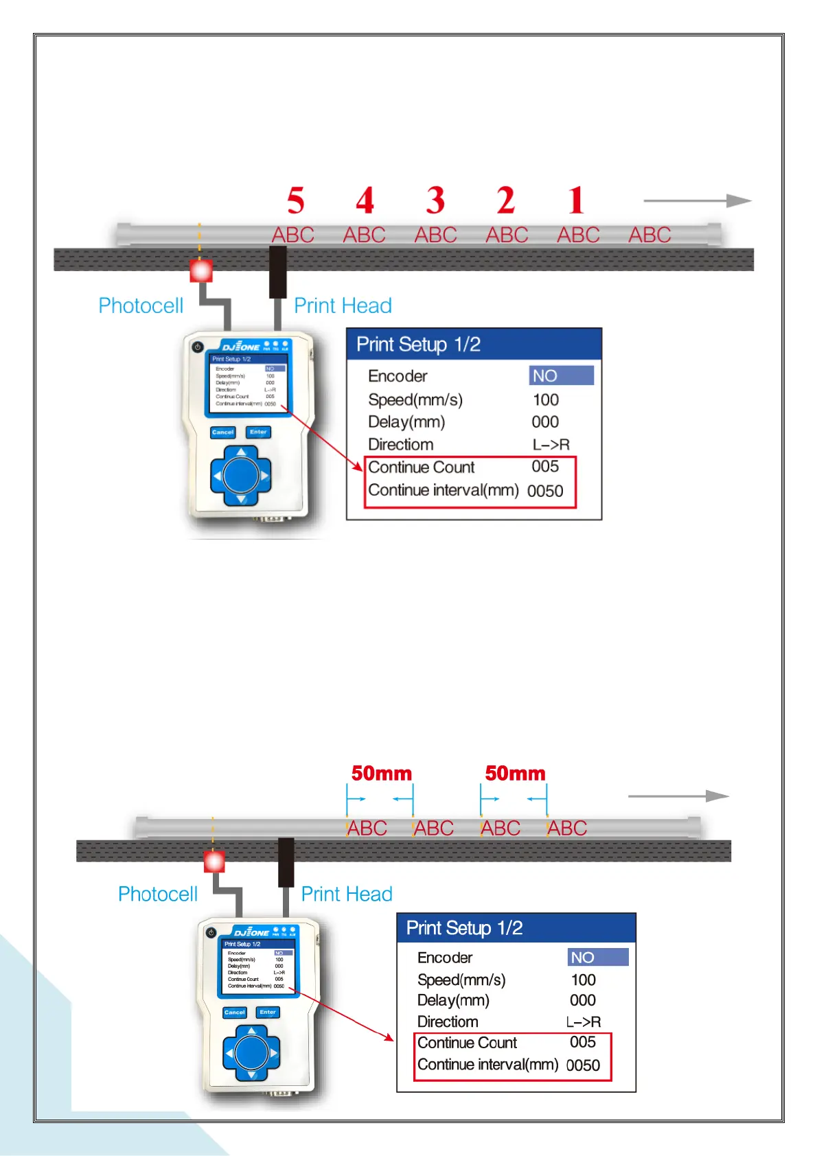 If ‘Continue Interval’ is set at 0050mm, the print head will repeat print every 50mm