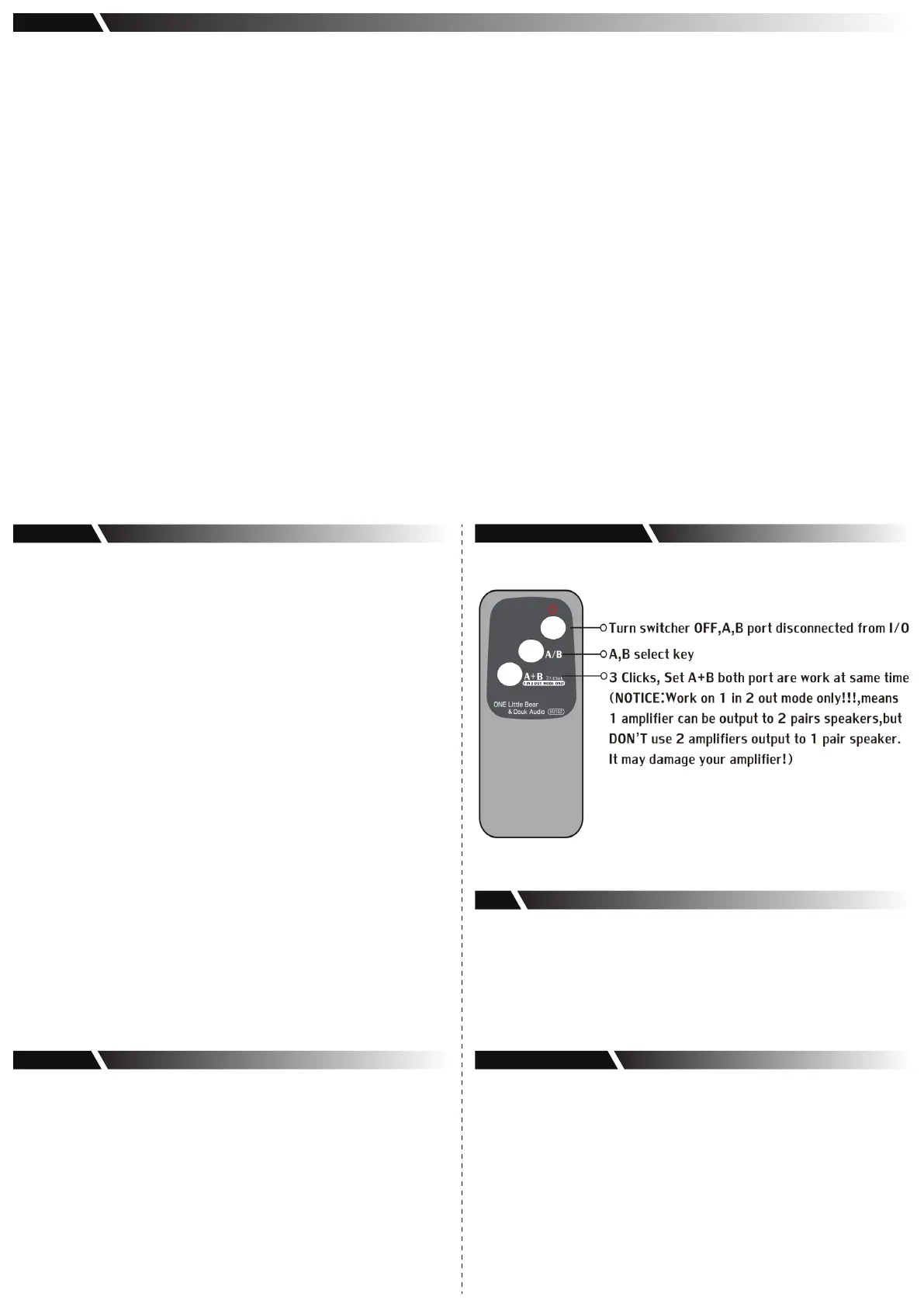 (Note: A/B parallel work mode does not support 2-IN-1-OUT mode, it will damage your amplifier.)