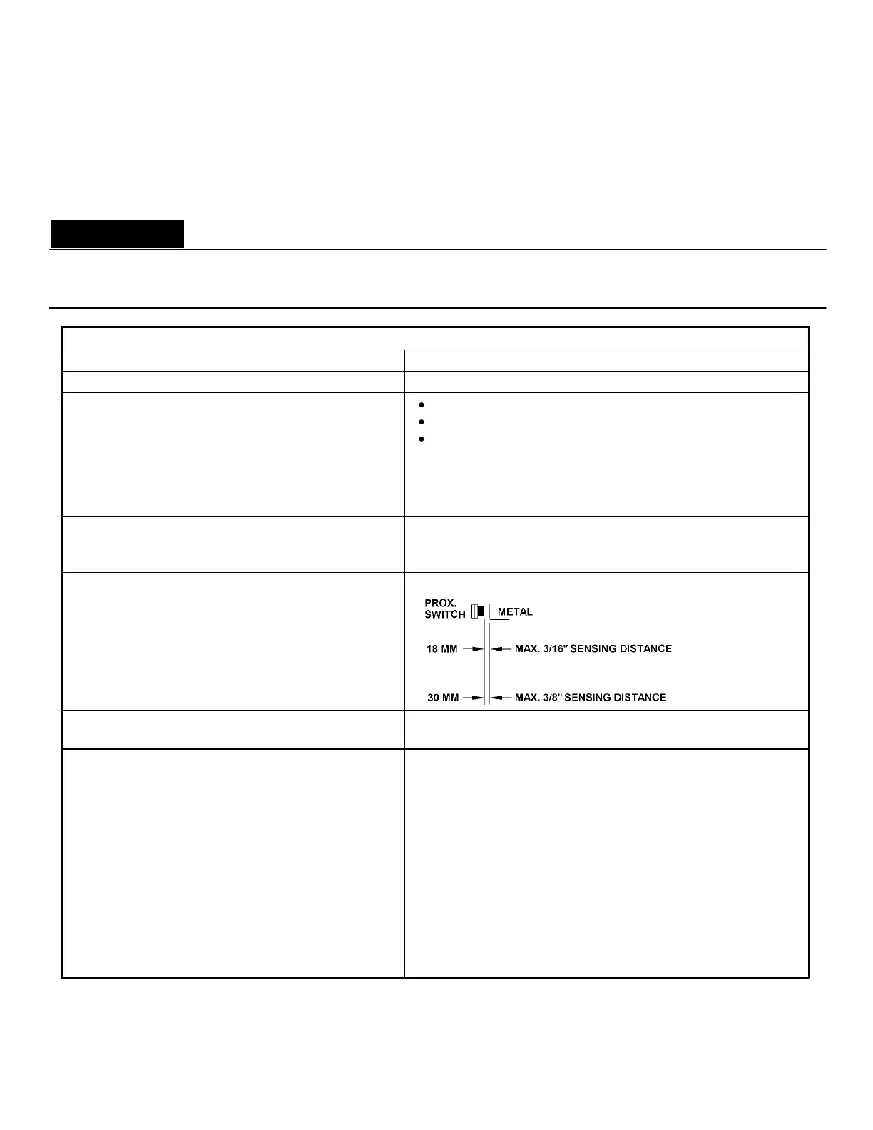 Proximity Switch Troubleshooting Table