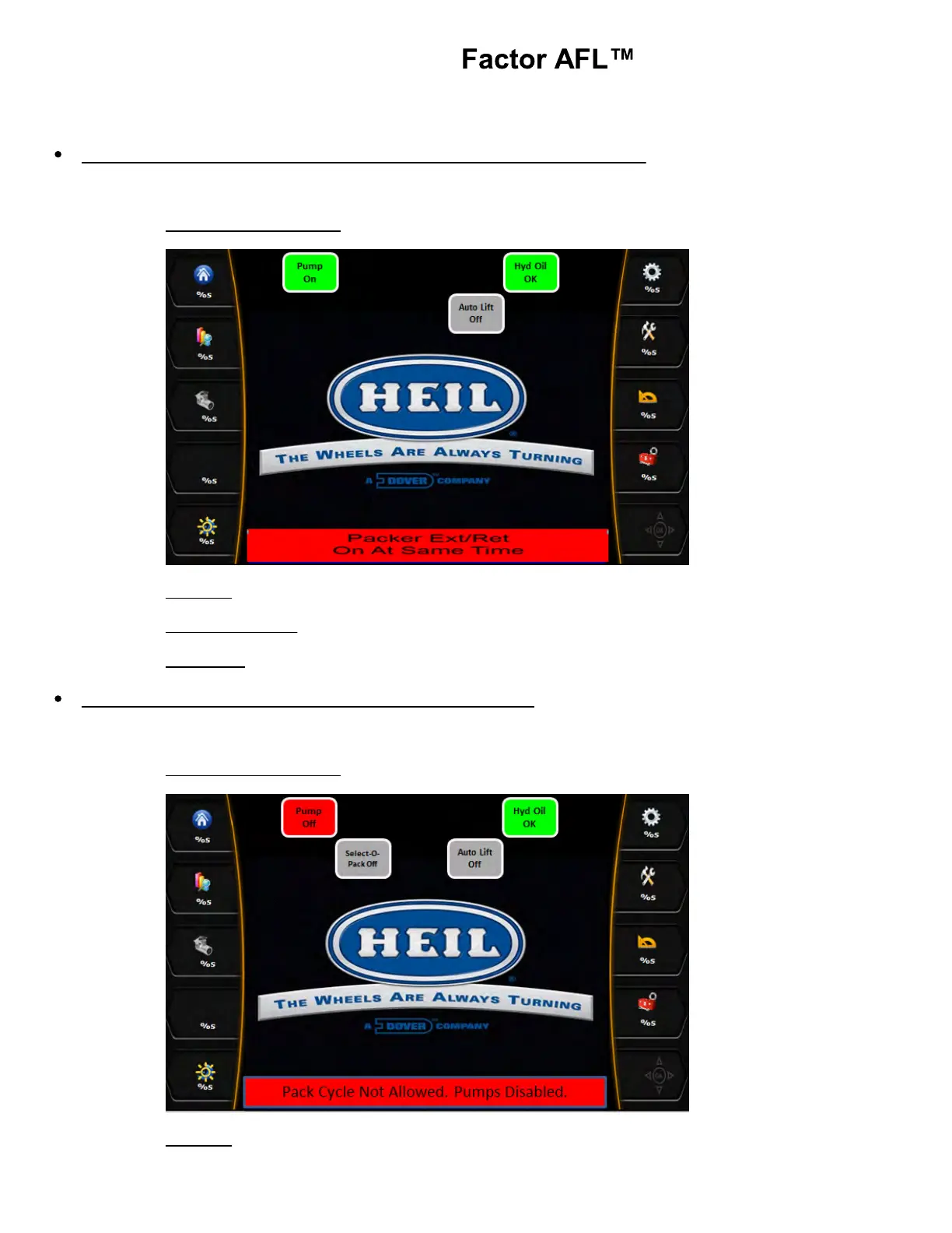 If the packer extend push button was pressed without the pump being ON, the diagnostic message will be displayed in