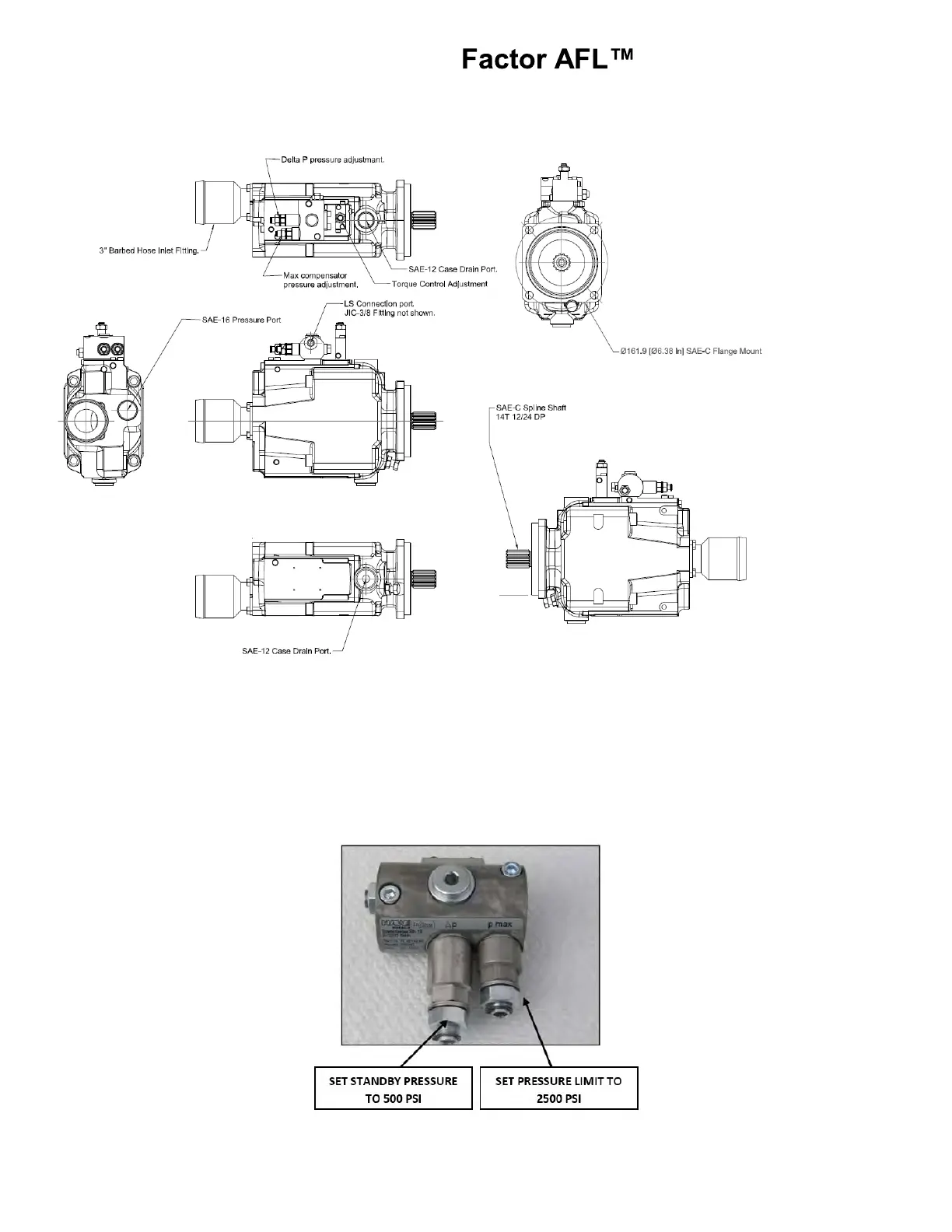 The Compensator regulates the hydraulic pressure and is preset at the factory. It is set to signal the pump to provide and