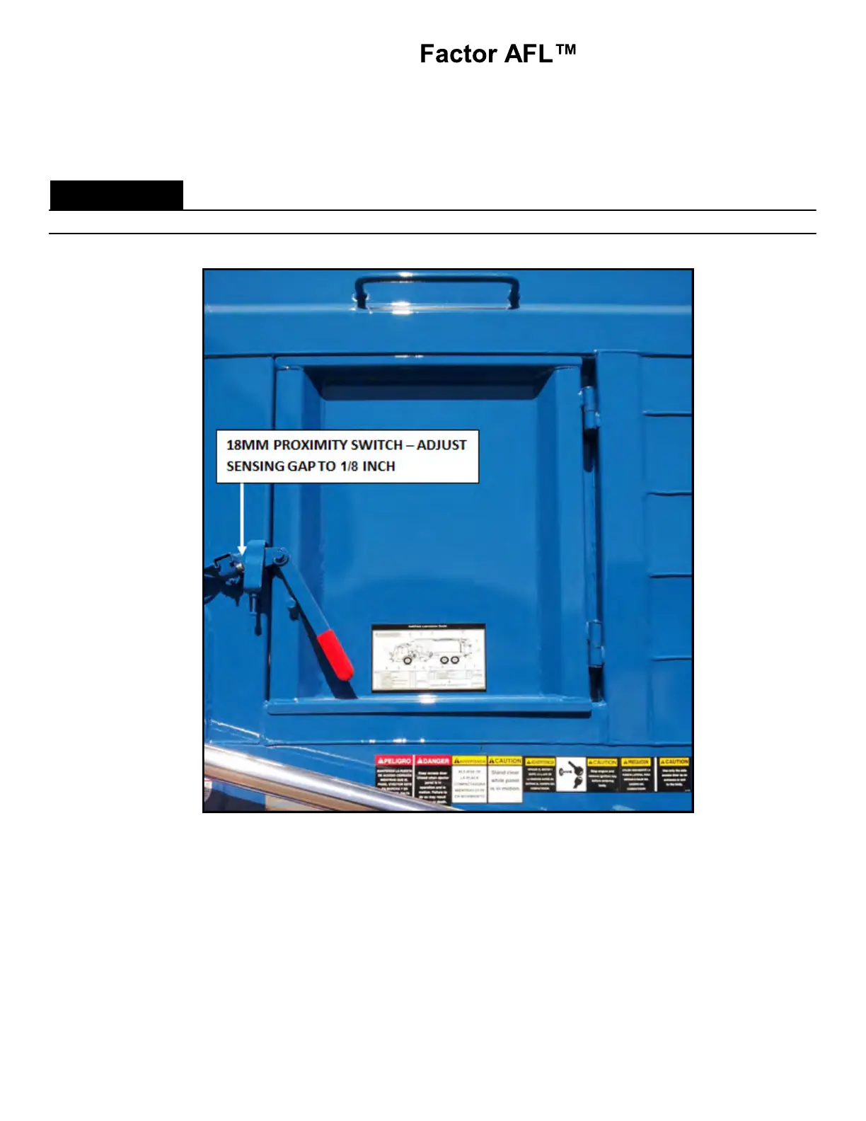 One 18mm sourcing or sinking proximity switch located by the side access door. This switch is adjusted properly when the