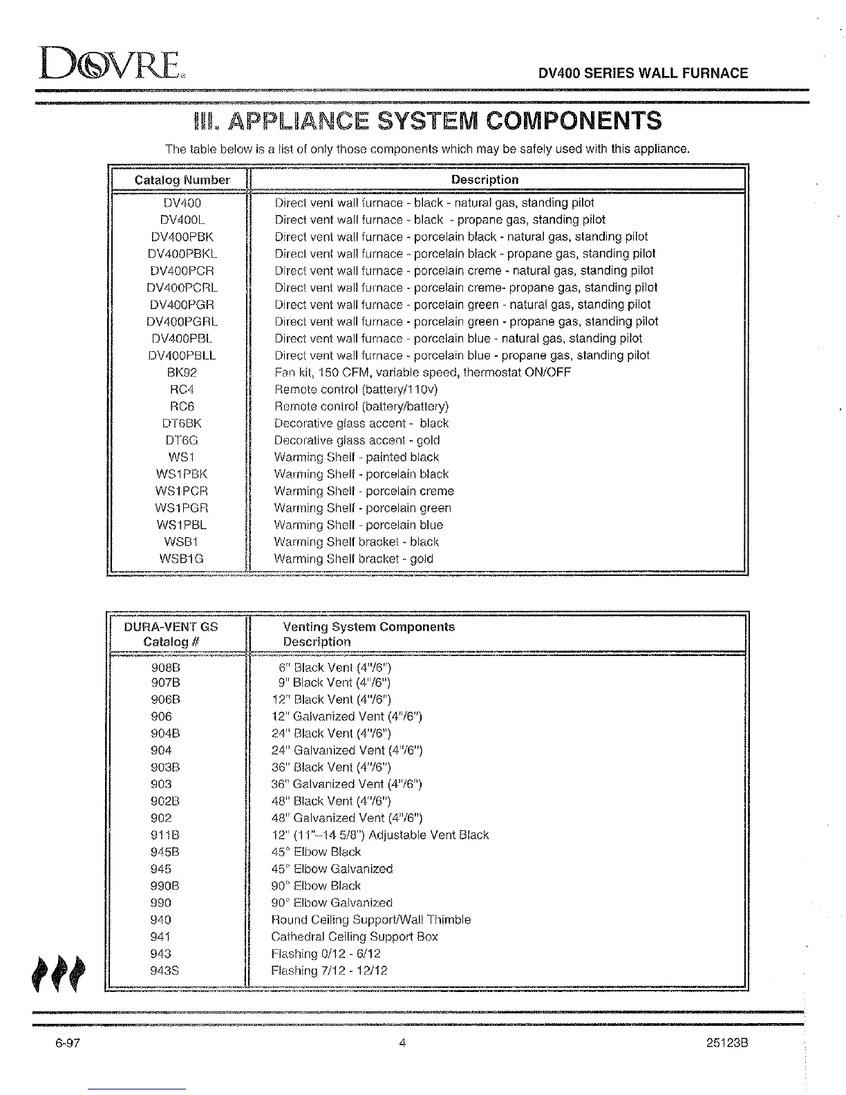 Dovre DV400 - III. APPLIANCE SYSTEM COMPONENTS