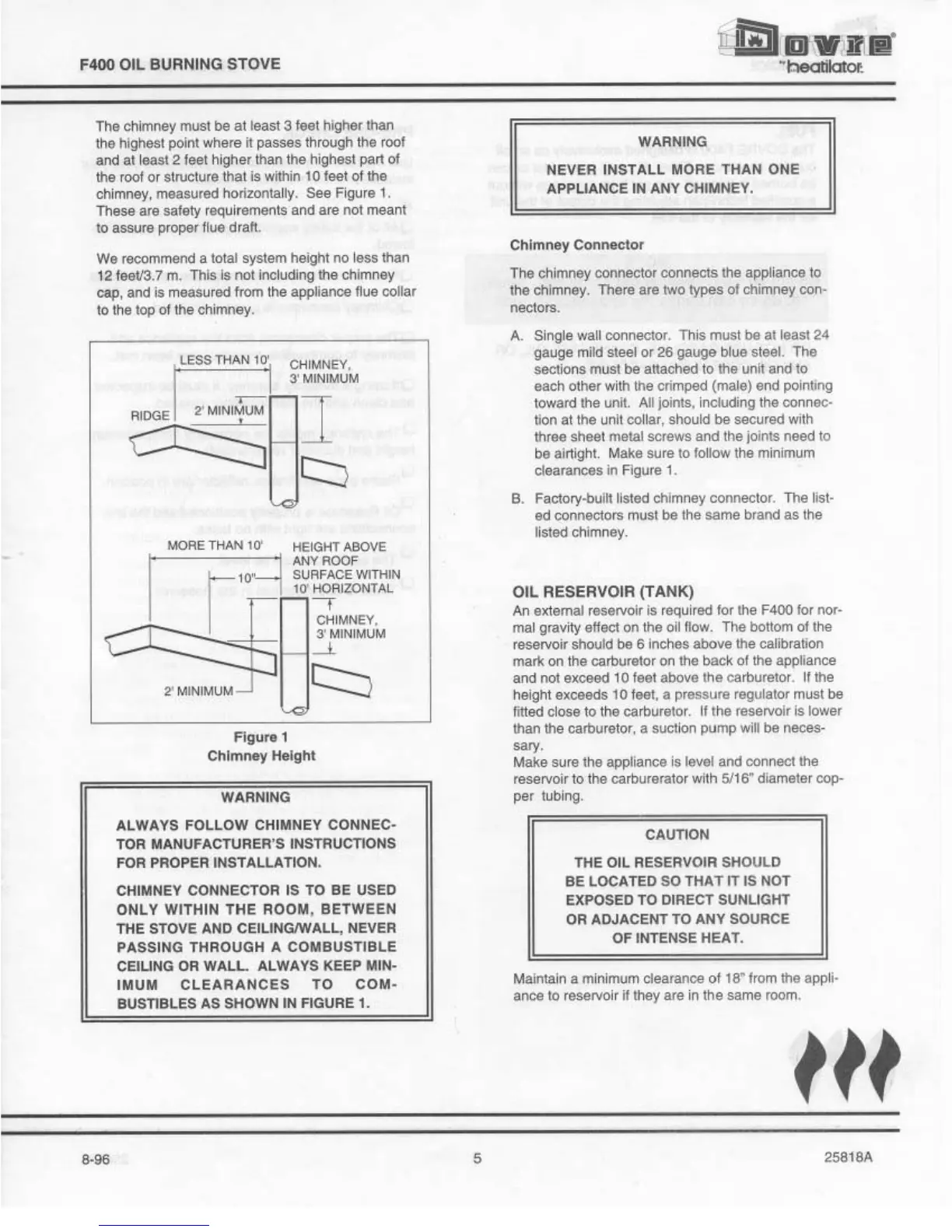 Dovre F400 - Oil Reservoir; Chimney Connector; Chimney Height