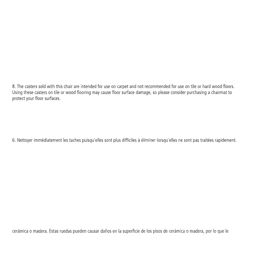 8. Las ruedas que vienen con este sillón han sido diseñadas para pisos alfombrados. No es recomendable su uso en pisos de