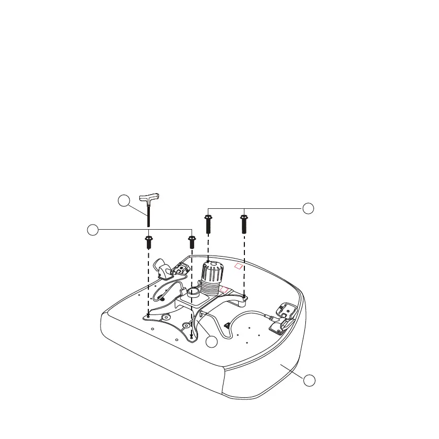 utilisant les grosses vis de 44 mm (I) dans les trous avant de la plaque de siège (D) et les grosses vis de 25 mm (H) dans les trous arrière