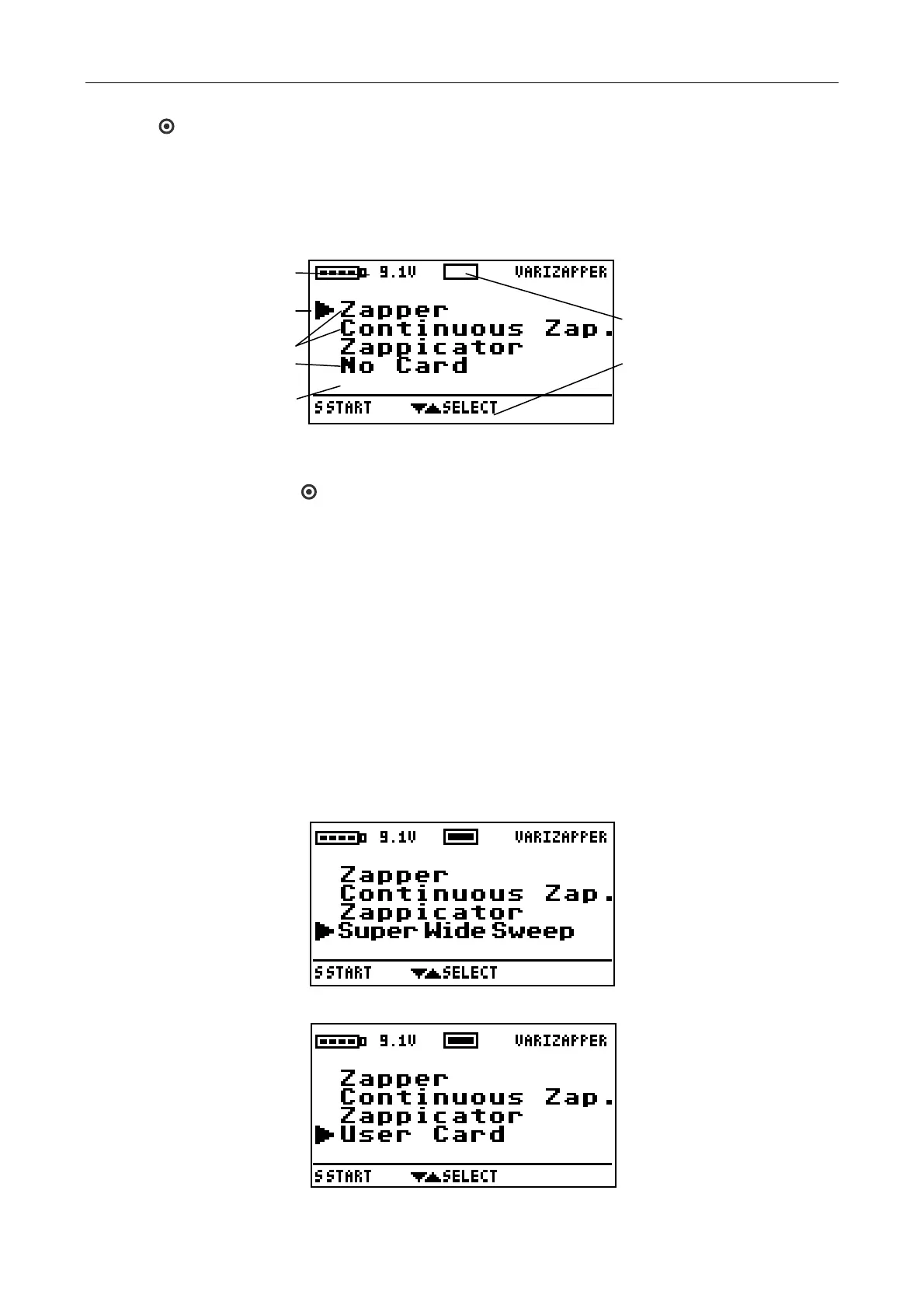 Press the button to turn on the VariZapper. After the greeting information and three tones the main menu