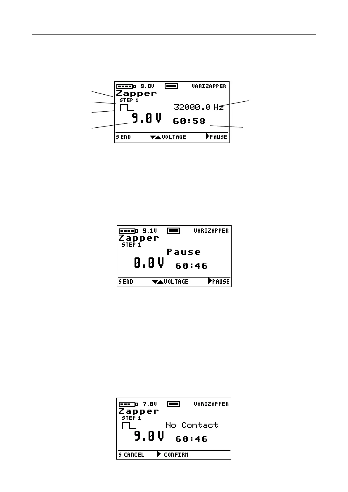 At the beginning of the session the VariZapper starts at the voltage set by the program. You can change the