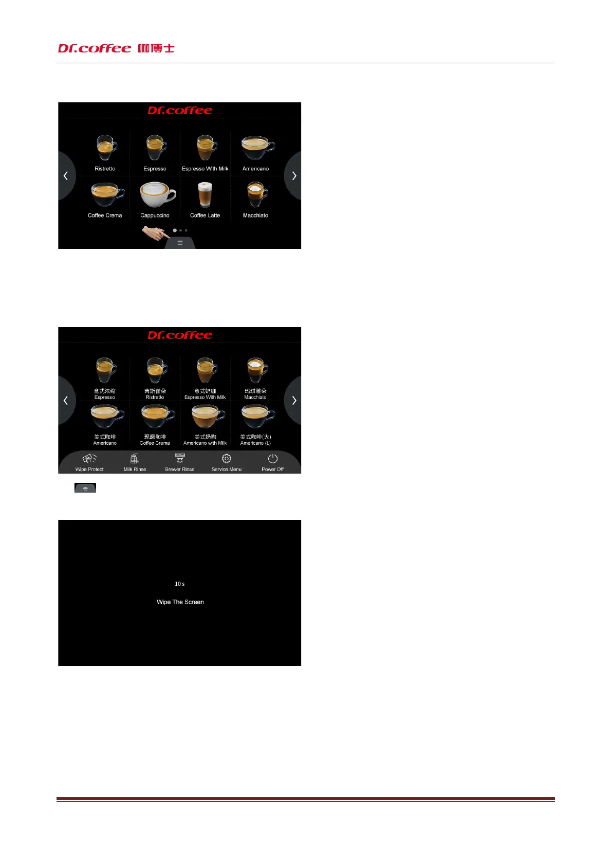 Dr.coffee F10 - Screenshot Description; Drinks Home Screen; Shortcut Menu Bar; Wipe Protect