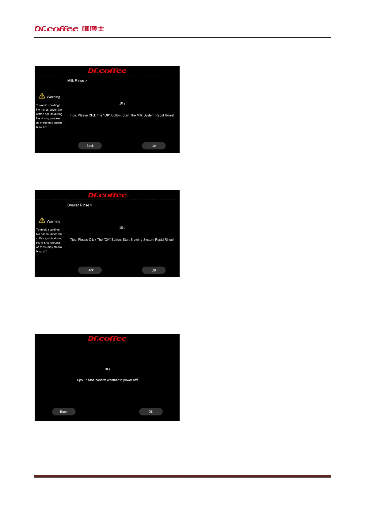 Tap “Power Off” to see the interface above “Back or Power off” for your choice, machine will proceed the process if no response in 10 seconds. Start rinsing process before power off