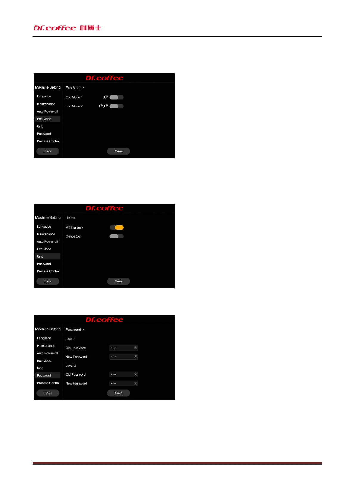 :Limited access to Service Menu (Including Drinks Setting, Maintenance, Machines Setting, default password is 1608)