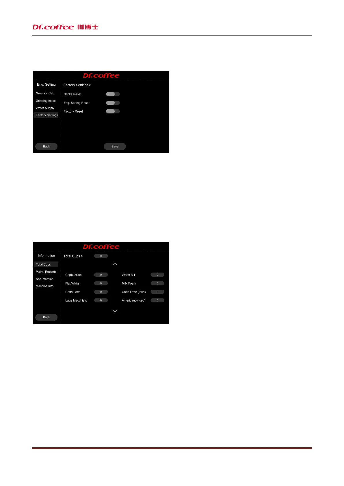 :Restore the coffee machine related parameters to the factory defaults. Click Save to restart the coffee machine.