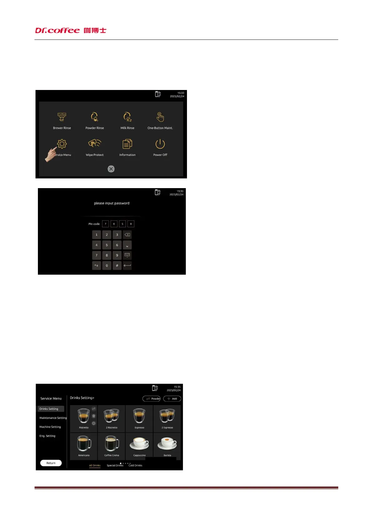 Secondary Password: Secondary level, limited access to Service Menu (Including Drinks Setting, Maintenance, Machines Setting, default password is 1709)
