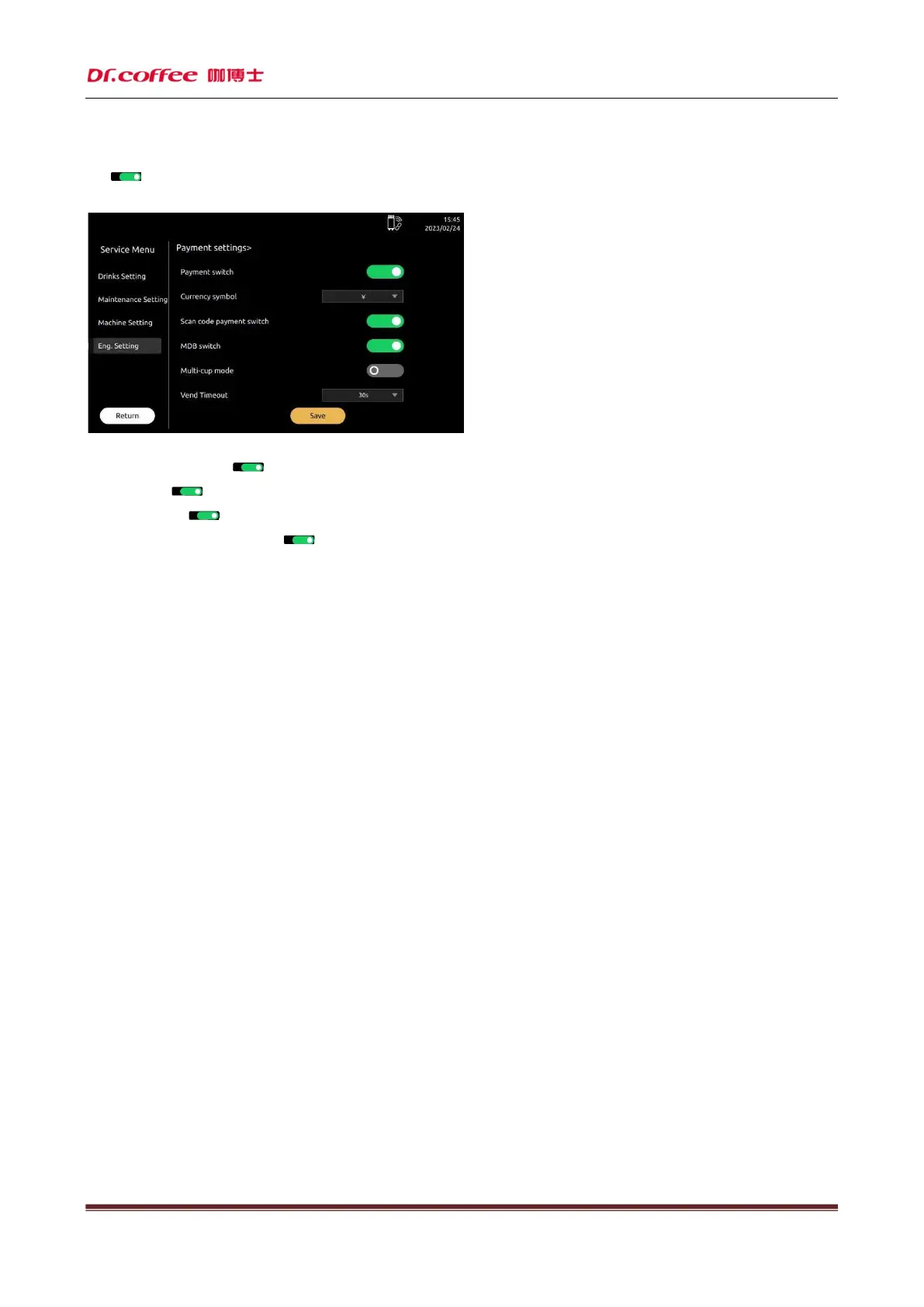 Payment Switch:Turn on or turn off the payment setting. Need to turn on the network switch in the machine setting.
