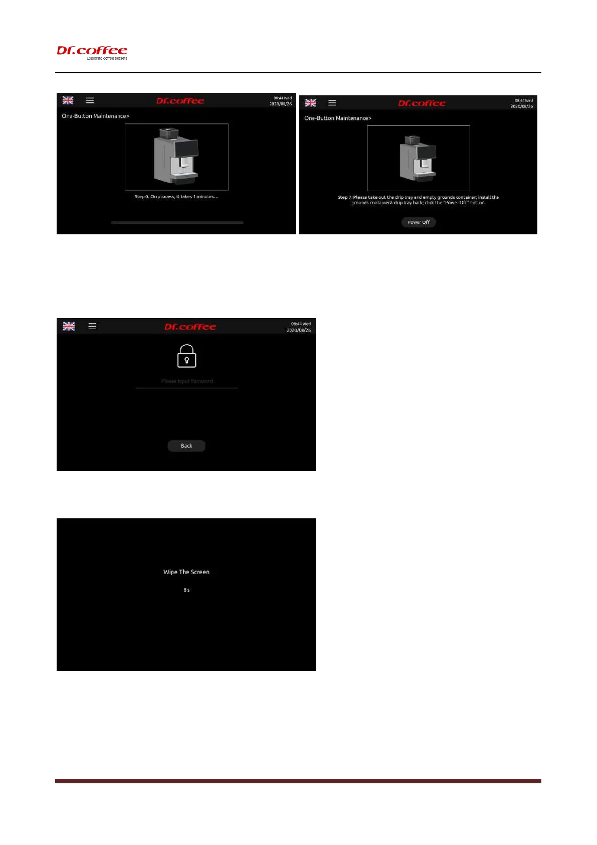 Tap “One-Button Maintenance.” to see the interface above “Back or OK” for your choice, machine will proceed the process if no response in 5 seconds.