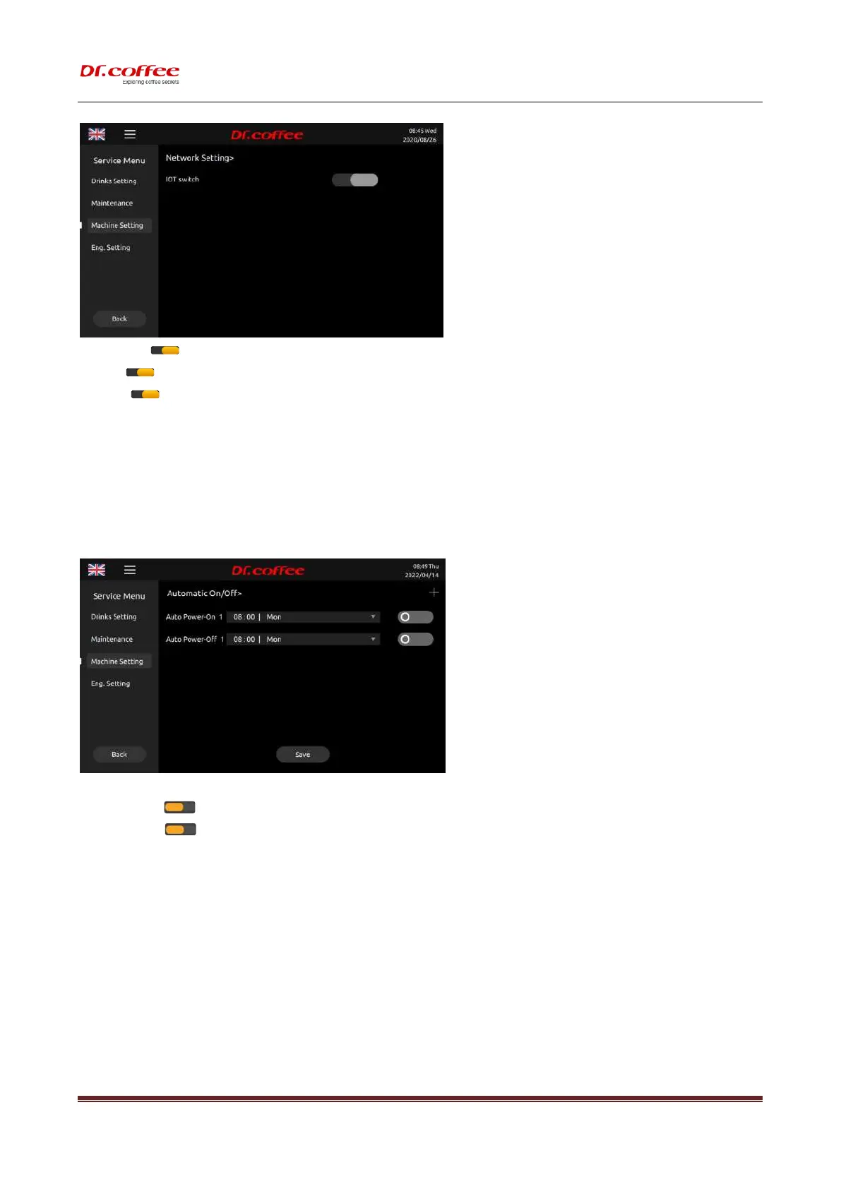 Auto Power On/ Off: Set the time for the coffee machine to automatically shut down. Tap “Save” to effect