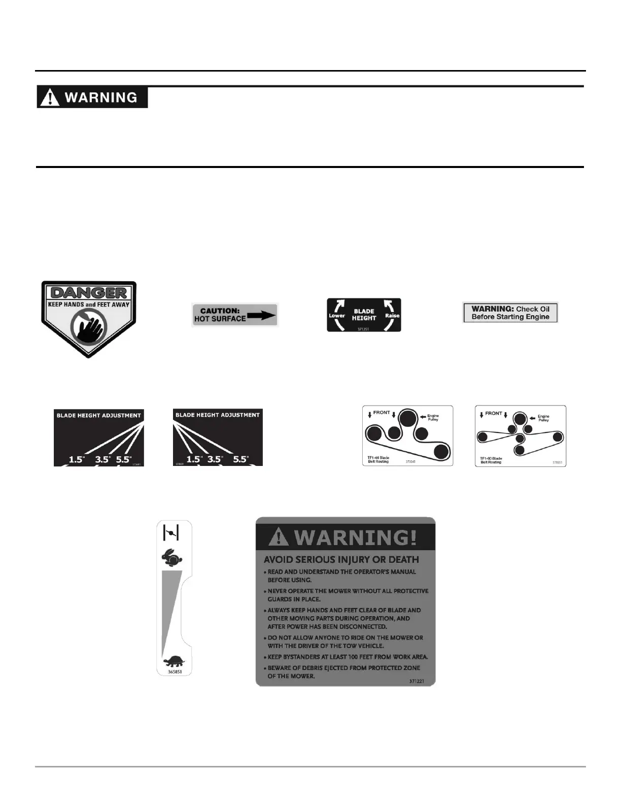Your DR TOW-BEHIND FINISH MOWER carries prominent labels as reminders for its proper and safe use. Shown below are