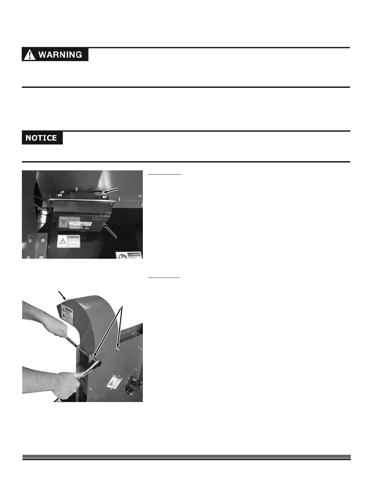 Never pry against the Scroll Weldment when removing the Deflector or Discharge Chute or at any other time. This will cause