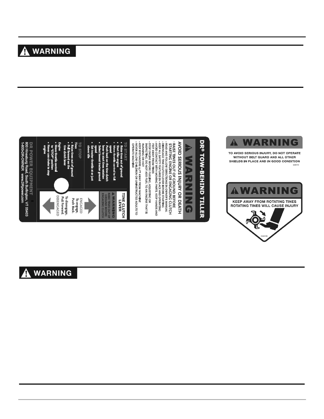 Your DR TOW-BEHIND ROTOTILLER carries prominent labels as reminders for its proper and safe use. Shown below are copies