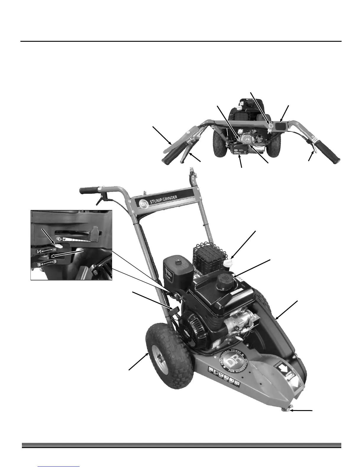 It may be helpful to familiarize yourself with the controls and features of your DR STUMP GRINDER as shown in Figure 1 before