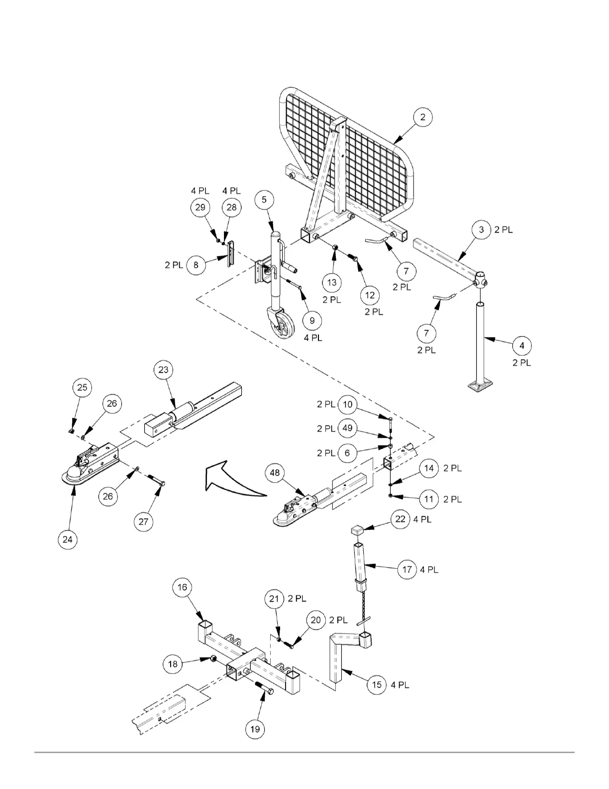 Schematic DR VERSA TRAILER Operator Guard, Trailer Jack, Rear Bed Support, and Pivoting Tow Hitch