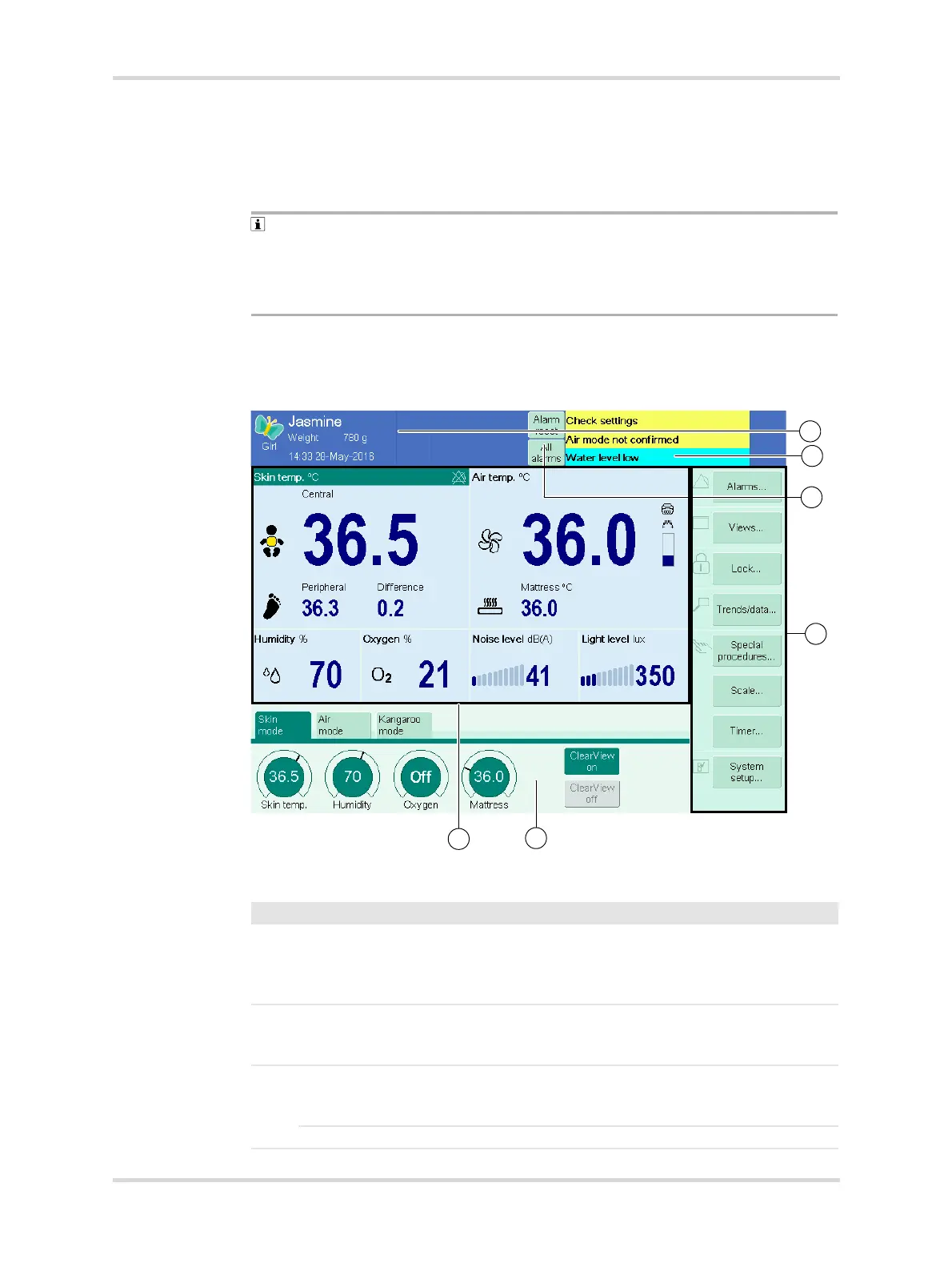 2 Alarm message field Shows up to 3 active alarms at the same time.