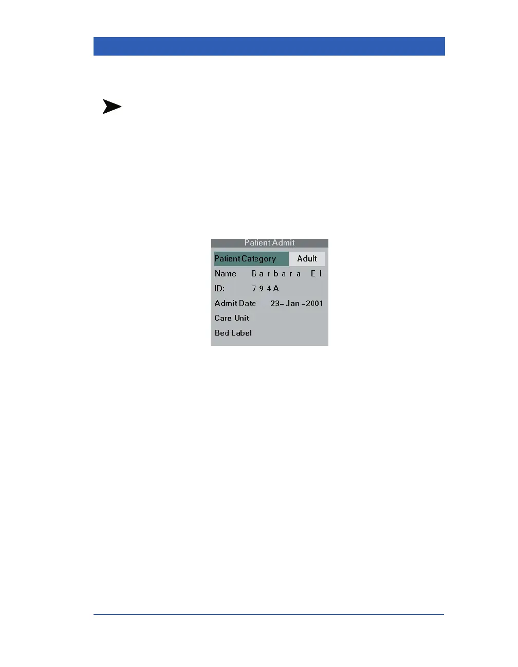 1. Call up the Patient Admit menu (Menu > Admit/Discharge >