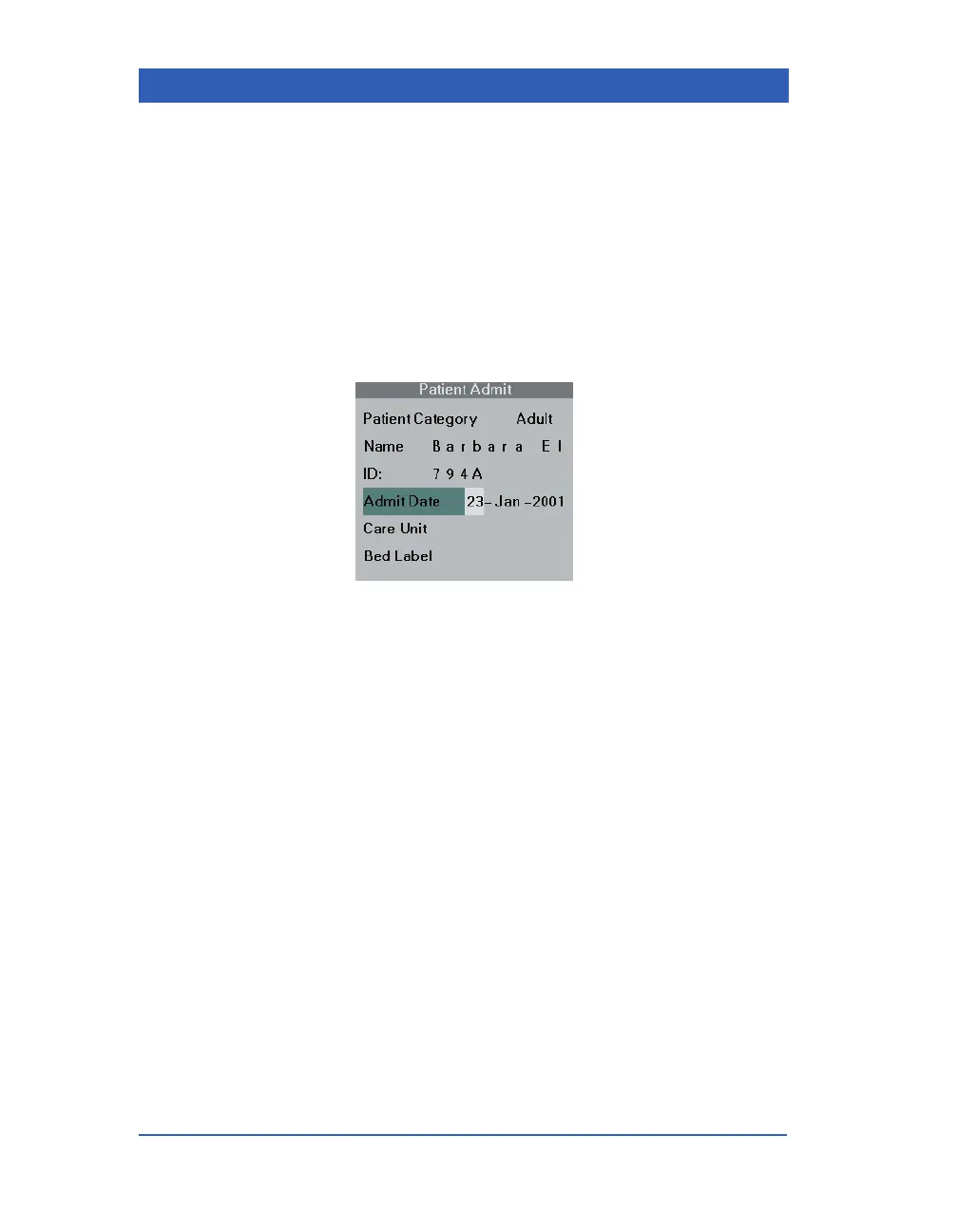 1. Call up the Patient Admit menu (Menu > Admit/Discharge >