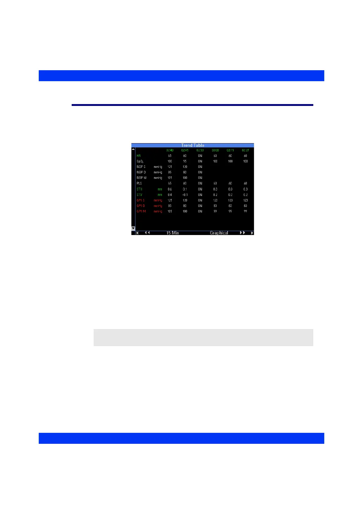 the trend table, the monitor shows the most recent trend values in the right column for