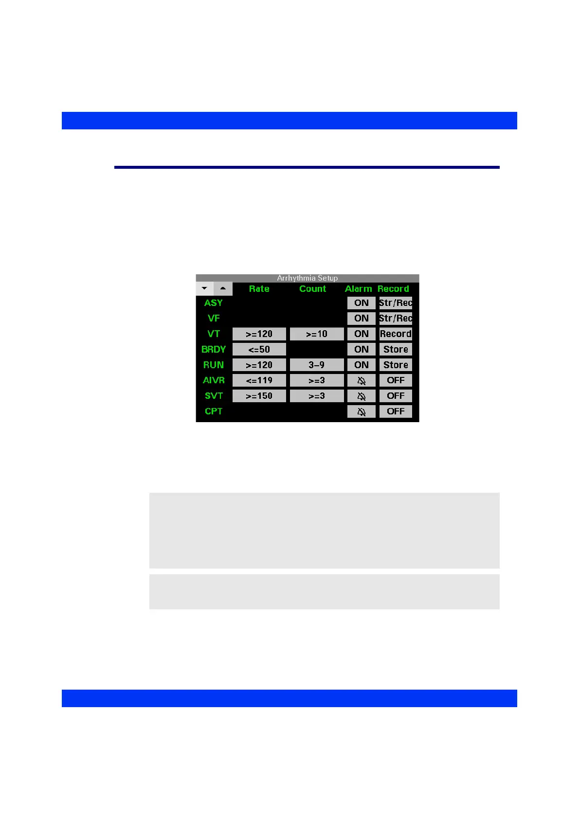 parameters and turn alarms and alarm recordings on or off. Call up the Arrhythmia