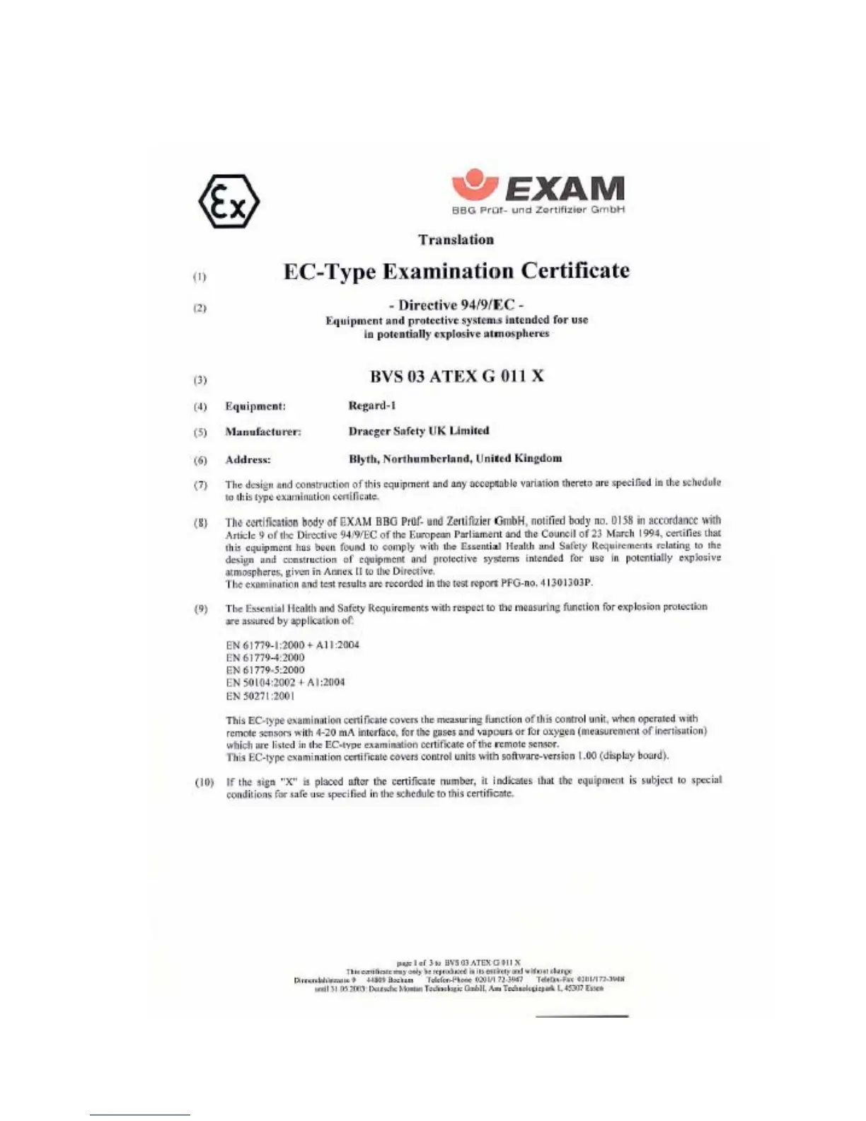 Dräger REGARD-1 - EC Type-Examination Certificate; Certificate Details and Directives; Essential Health and Safety Requirements; Test Report and Safe Use Conditions