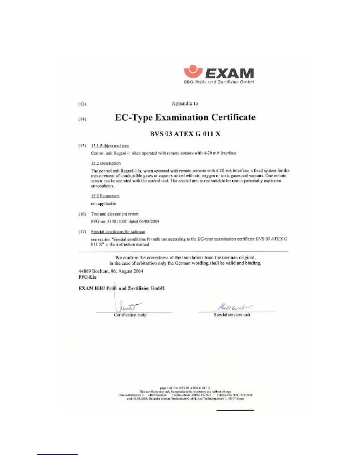Dräger REGARD-1 - EC Type-Examination Certificate Appendix; Subject and Type Description; Parameters and Test Report; Confirmation of Translation Accuracy