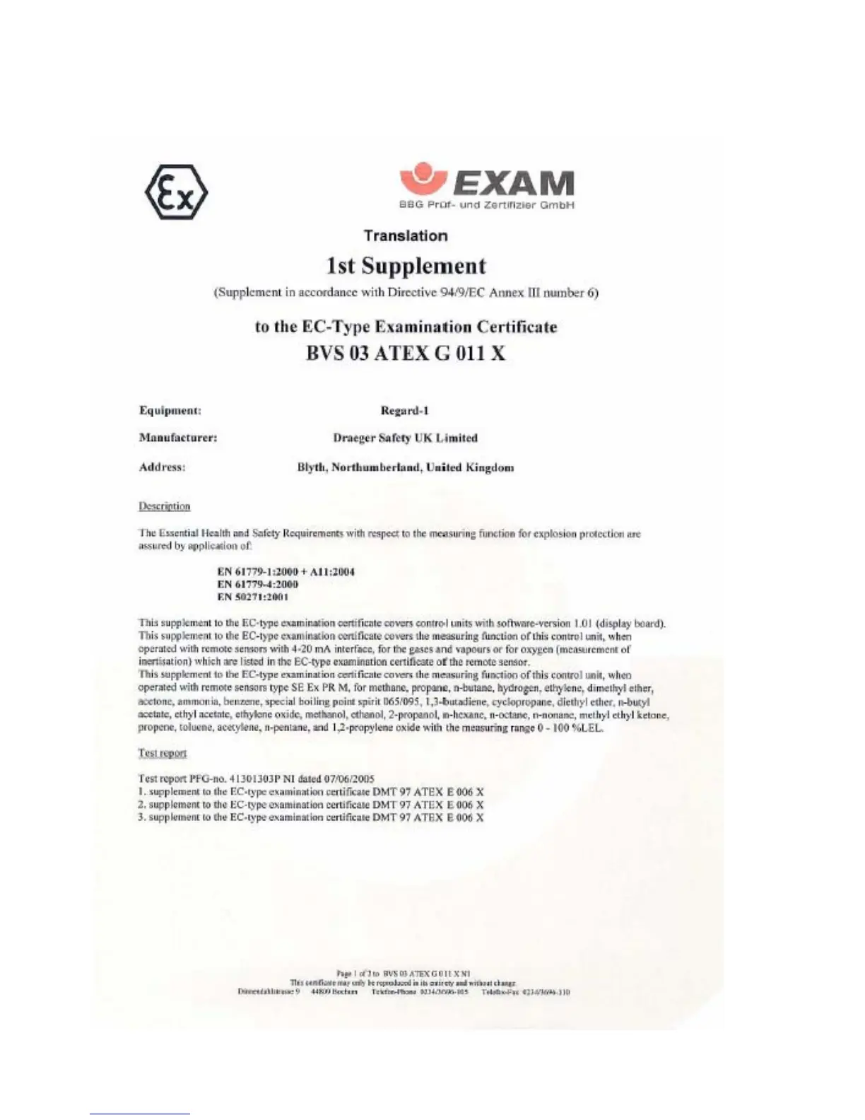 Dräger REGARD-1 - EC Type-Examination Certificate 1 st Supplement; Supplement Description and References