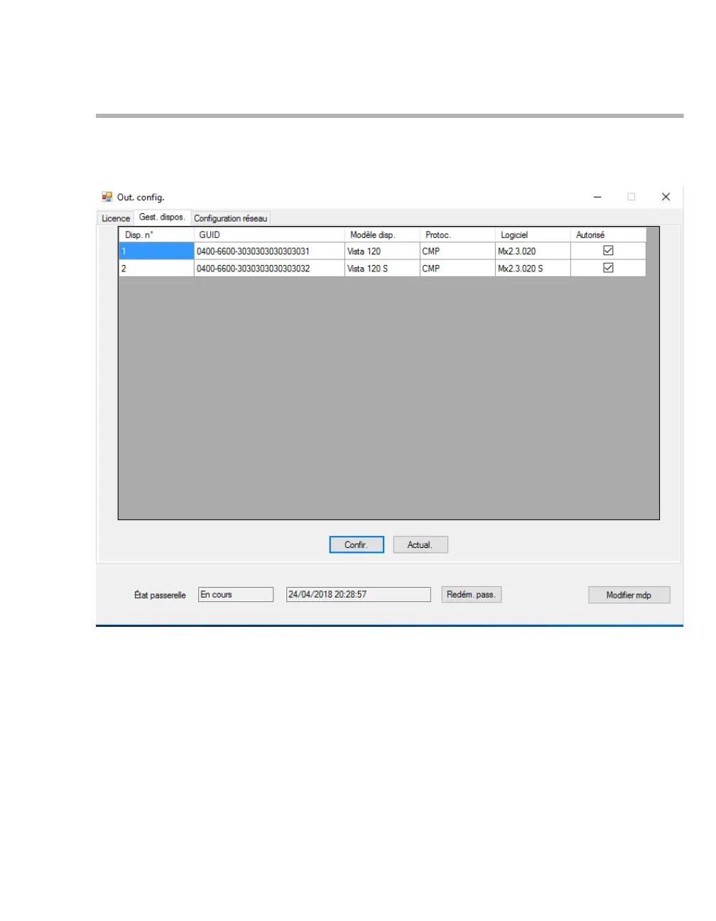 La fenêtre Gest. dispos. affiche des informations sur les dispositifs connectés, par exemple : Disp. n°,