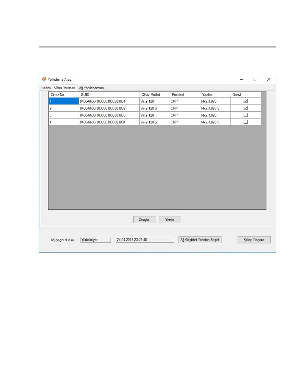 Cihaz yönetimi penceresinde bağlı cihazlara ilişkin olarak Cihaz No., GUID, Cihaz Modeli, Protokol,