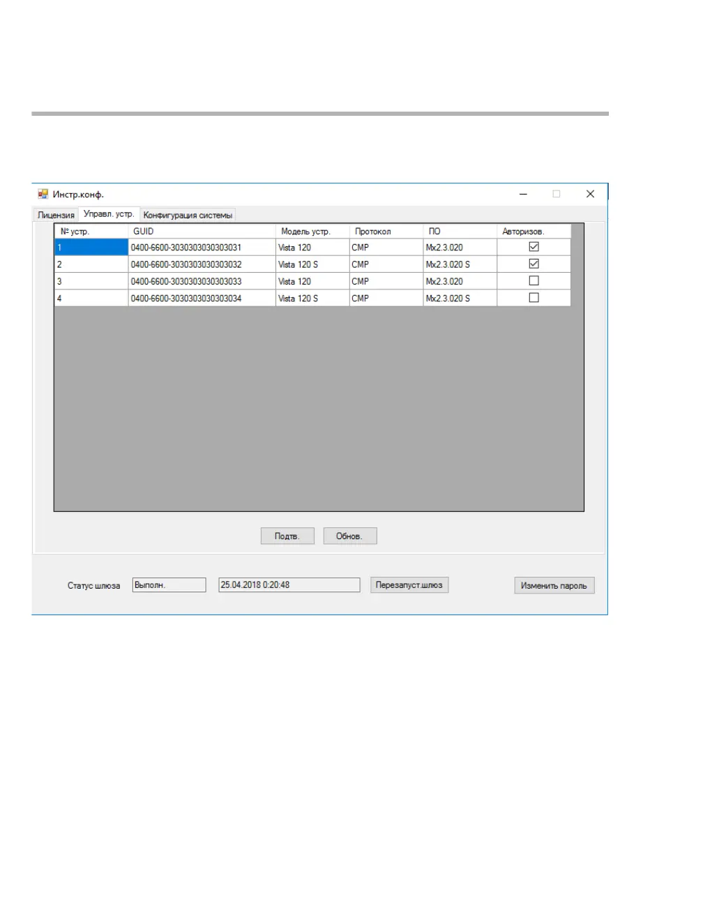 относящиеся к пунктам «№ устр.», «GUID», «Модель устр.», «Протокол», «ПО», «Авторизов.».