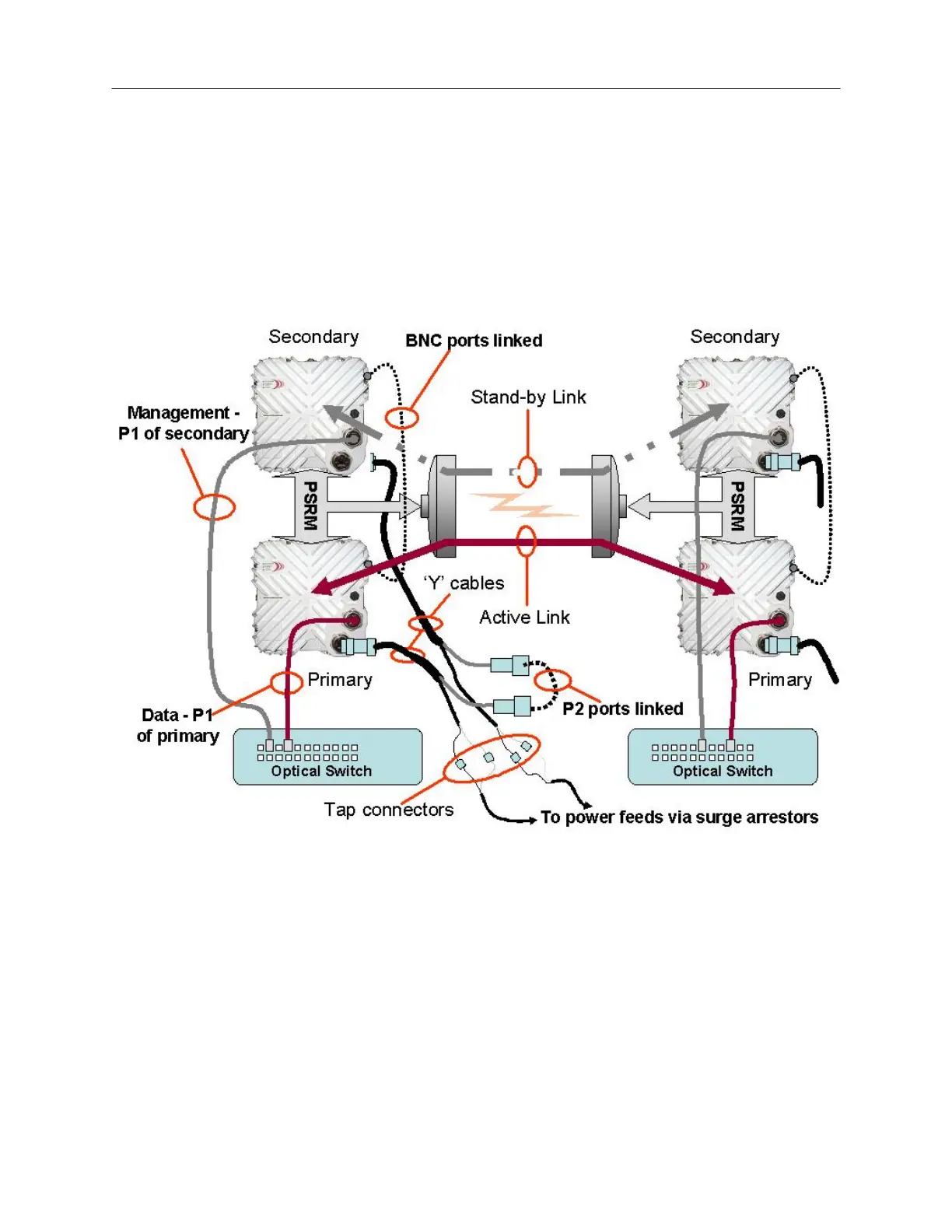 The optical data feed is connected to Port 1 (P1) of the Primary unit and management is fed to Port 1 of