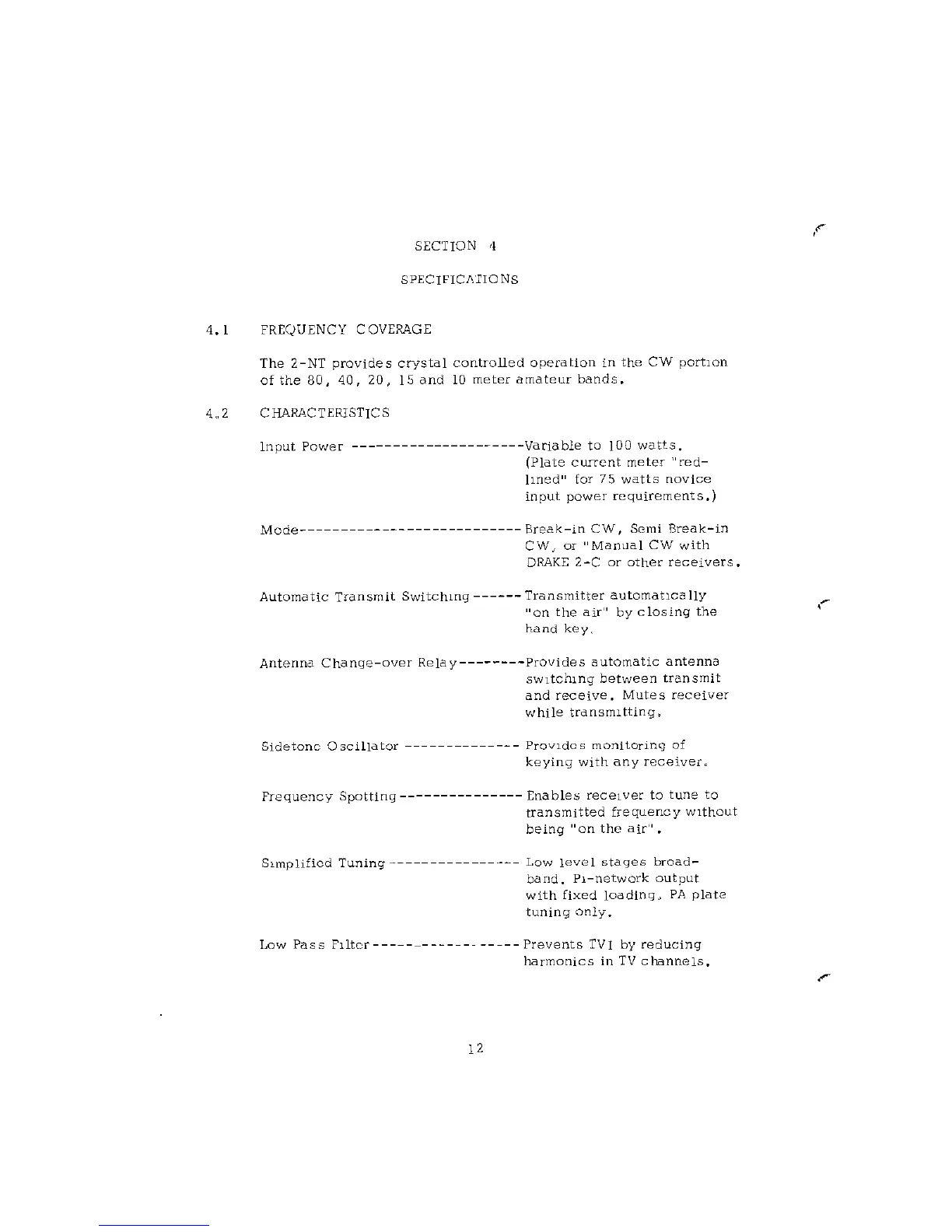 DRAKE 2-nt - SECTION 4 SPECIFICATIONS; FREQUENCY COVERAGE; CHARACTERISTICS