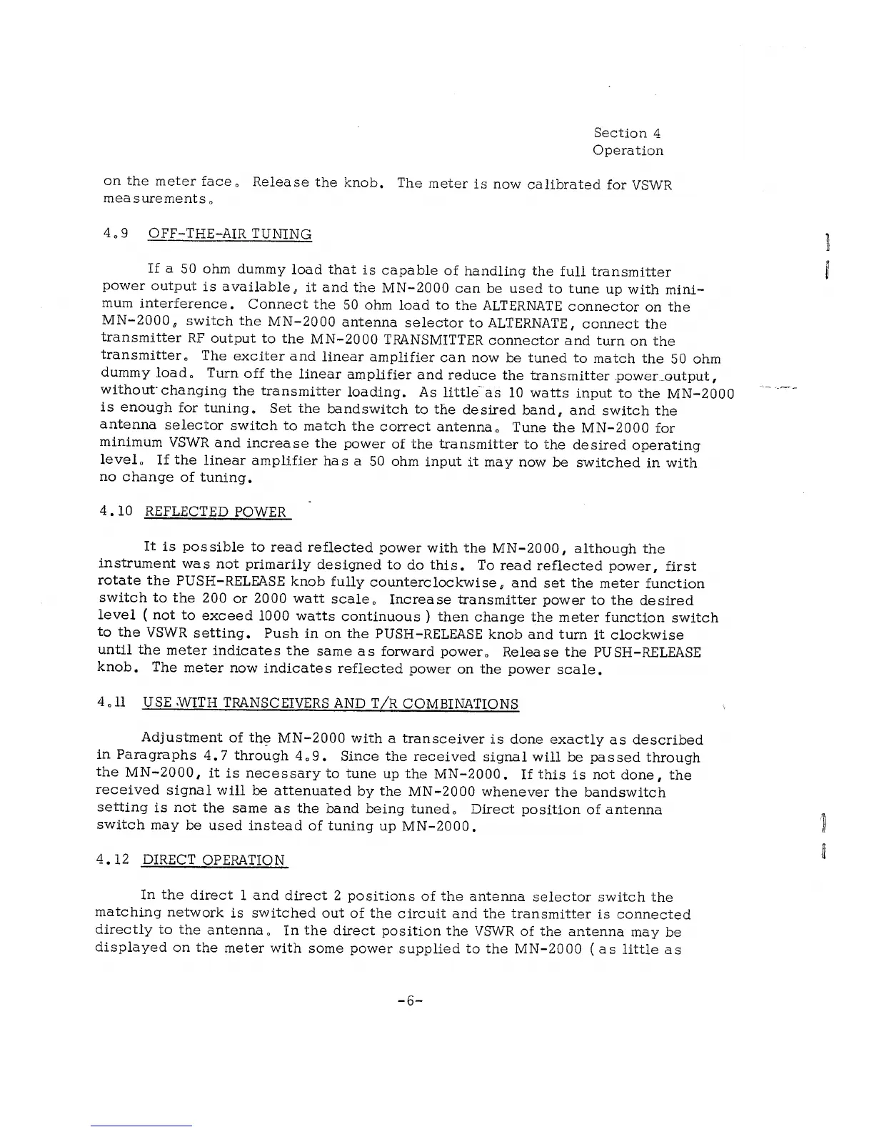 DRAKE MN-2000 - Advanced Operational Techniques; Off-the-Air Tuning and Reflected Power; Transceiver Use and Direct Operation