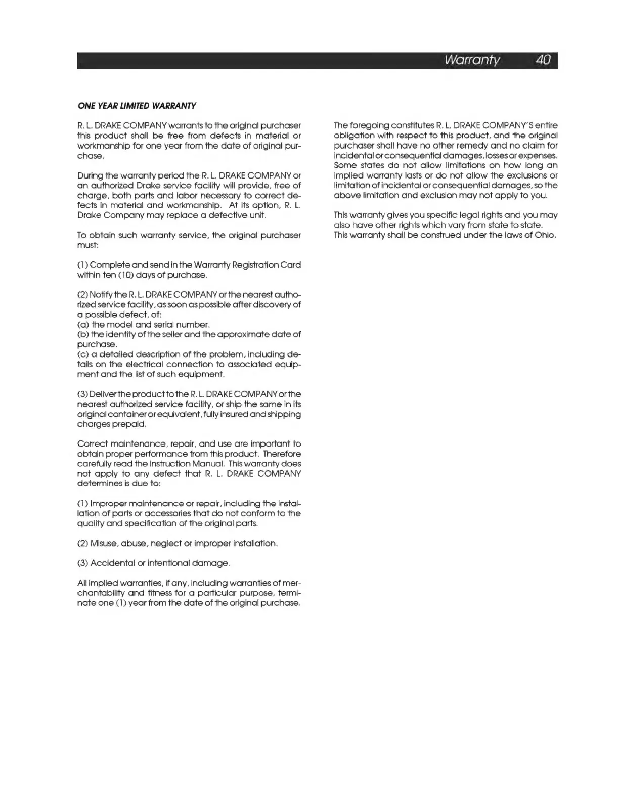 DRAKE R8A - Warranty; ONE YEAR LIMITED WARRANTY