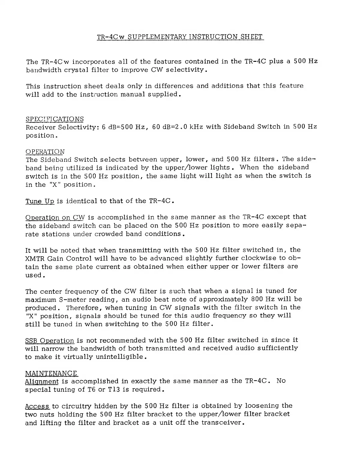 DRAKE TR-4CW - TR-4 CW Supplementary Instruction Sheet