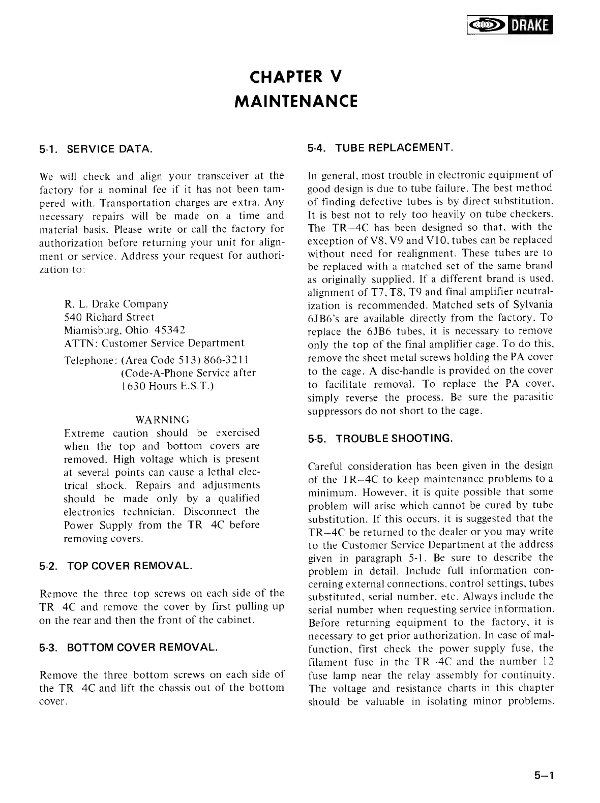 DRAKE TR-4CW - Chapter V: Maintenance; Service, Troubleshooting, and Covers